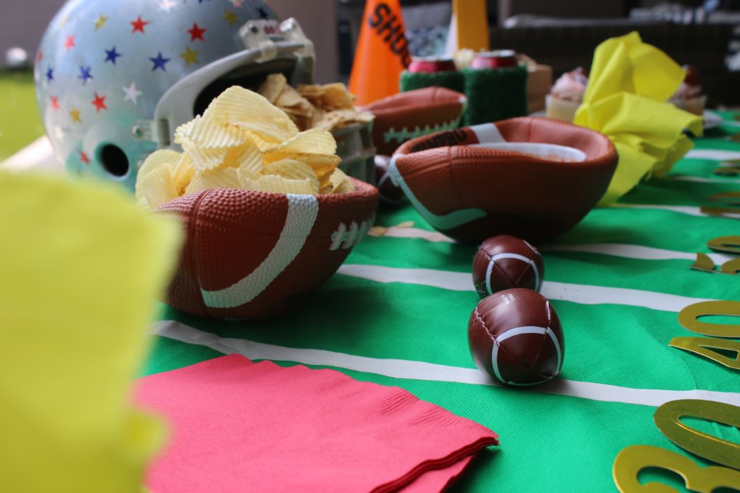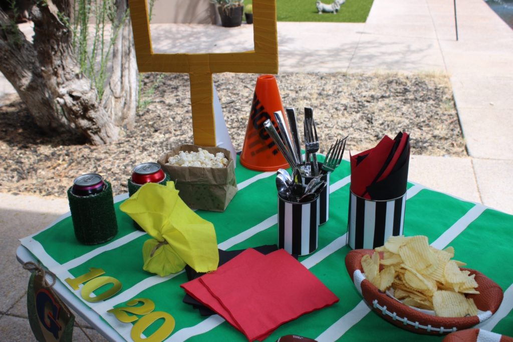 This décor is for the playmakers of the group, simply add some goal posts to the ends of your table by cutting out yellow foam core board or regular cardboard wrapped in yellow tape. You can attach a brown paper sack to the base and fill the bag with popcorn or other snacks. These end zones will see lots of TDs!