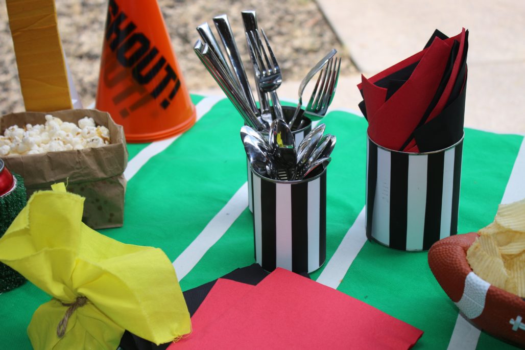 For your utensils, save those tin cans from the beans and tomatoes you used to make chili. Simply wash them out and cover them with white paper. Glue on strips of black construction paper and you’ve got referee utensil holders. Perfect for holding your knives, forks and spoons…and whistles.