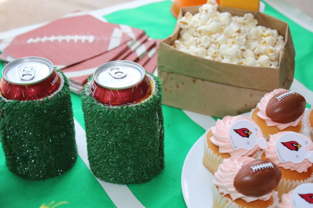 You will need to keep your beverages cool so make your own koozies from AstroTurf. You can use left over AstroTurf from another home improvement project, or ask the sales guy at the big box store, sometimes they have extra turf scraps laying around. Cut the turf to the height and circumference of the can using a blade or sharp scissors and then hot glue the ends together. This is a great way to keep your beverages cool and in the zone.