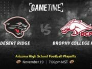 The Desert Ridge Jaguars (4-6) match up with the Brophy Broncos (6-4) in our Arizona high school football featured GameTime matchup this week – Friday, Nov. 19 at 7:00 pm MT/8:00 pm CT.