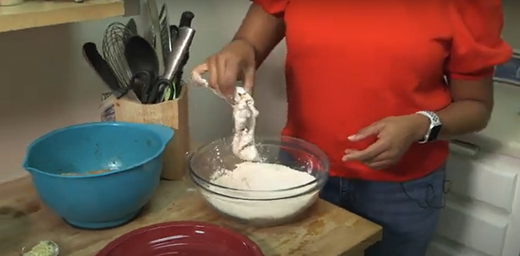 NM (1:01) In this bowl here, I have boneless, skinless chicken thighs and drumettes. So, this chicken is already well-seasoned. I have my own seasoning blend. Check out my website to get yours. And we’re going to add those exact same spices that I’ve added on the chicken into the flour. So, I’ve got it right here. Go ahead and add it to your flour so I can give it a little mix and start seasoning our chicken.