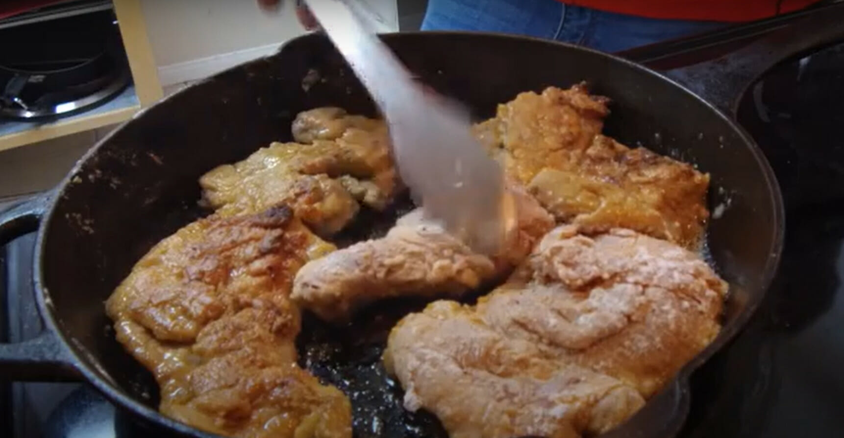NM (2:38) It’s been about five, seven minutes. Go ahead and flip this chicken. It should be nice golden brown on one side. Let’s go ahead and let it finish dancing on the stove. Cooking. It’s cooking, it’s cooking. All right this chicken is perfectly golden brown. So go ahead and take it out of the pan.