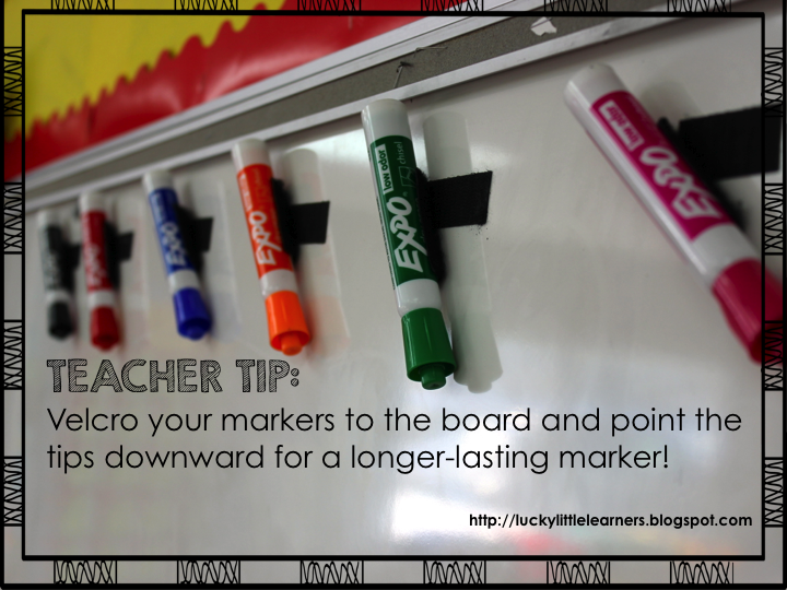 Dry erase markers can dry up quick and replacing them can get expensive; so try this pro-teacher tip: attach a piece of velcro to the marker and the other piece to the top of the white board. You will always have a place to put the marker and it will be easy to find. Remember to always let the marker hang upside down so the ink flows to the tip. To organize other small supplies, buy a spice rack from Walmart or Target to keep on your desk or in a closet nearby.
