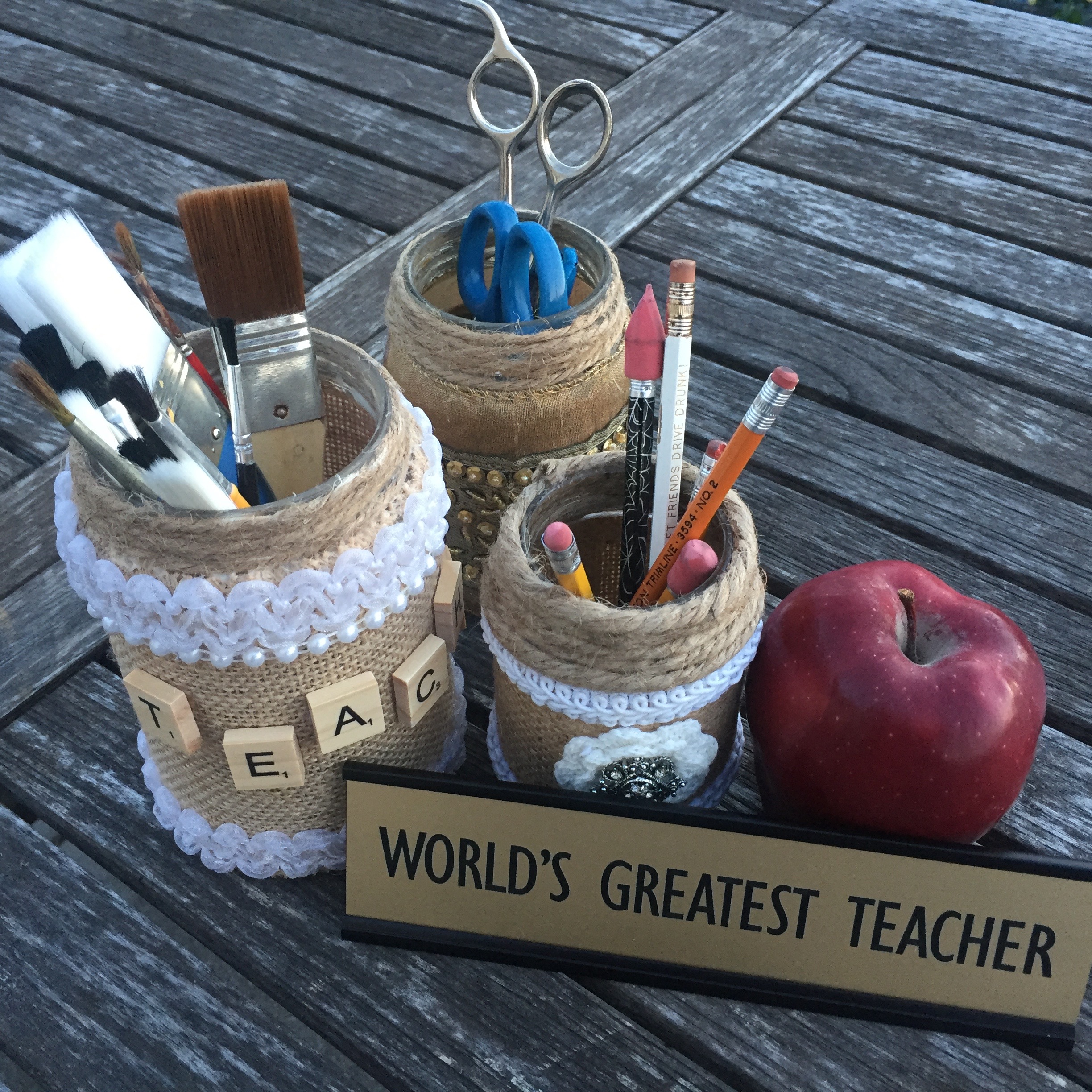 The next part is where you can get your creative juice flowing! Add ribbon to the base and top of the jar, or add twine to cover the edges. Using hot glue, add on any embellishments; for extra credit maybe even spell out the teachers name with scrabble pieces!