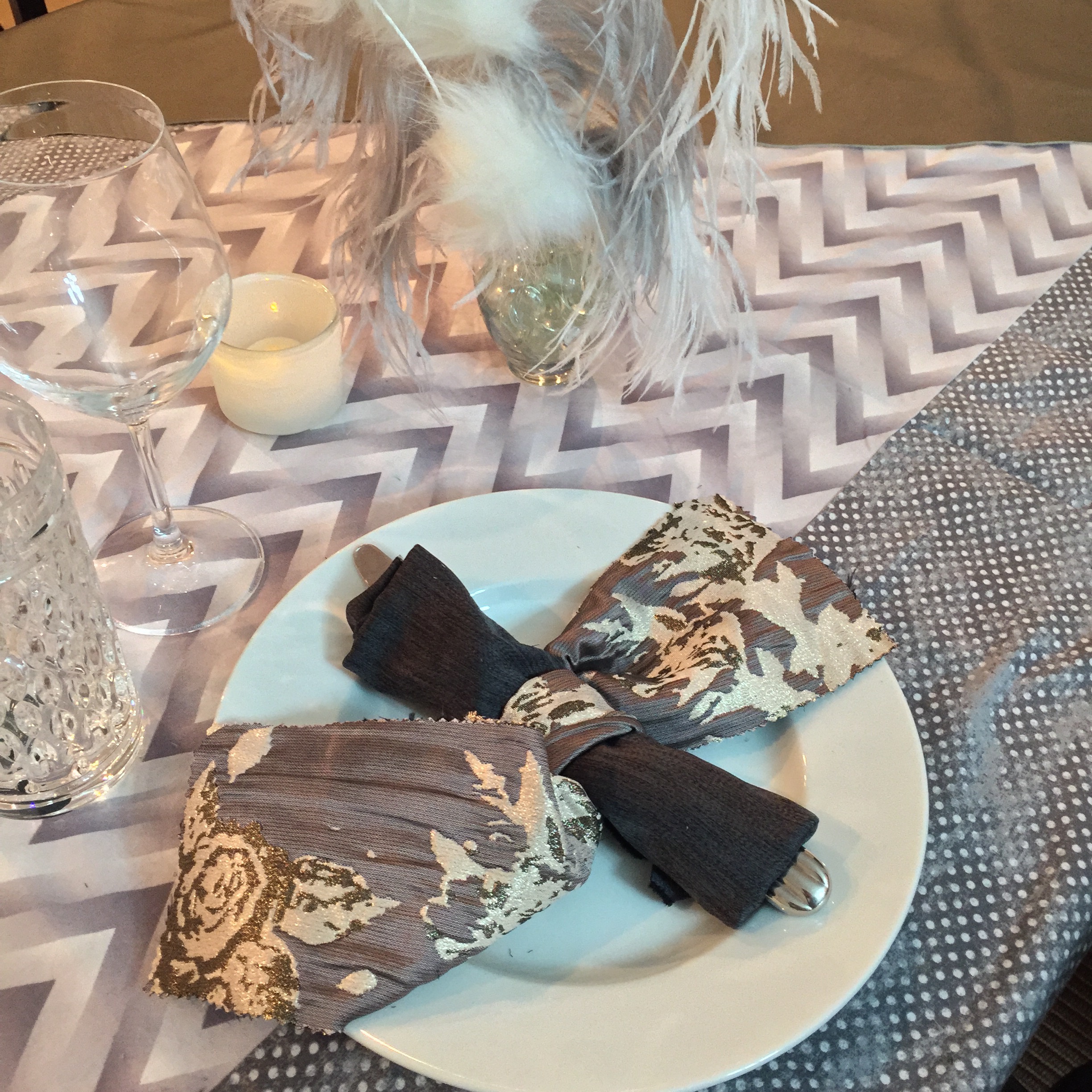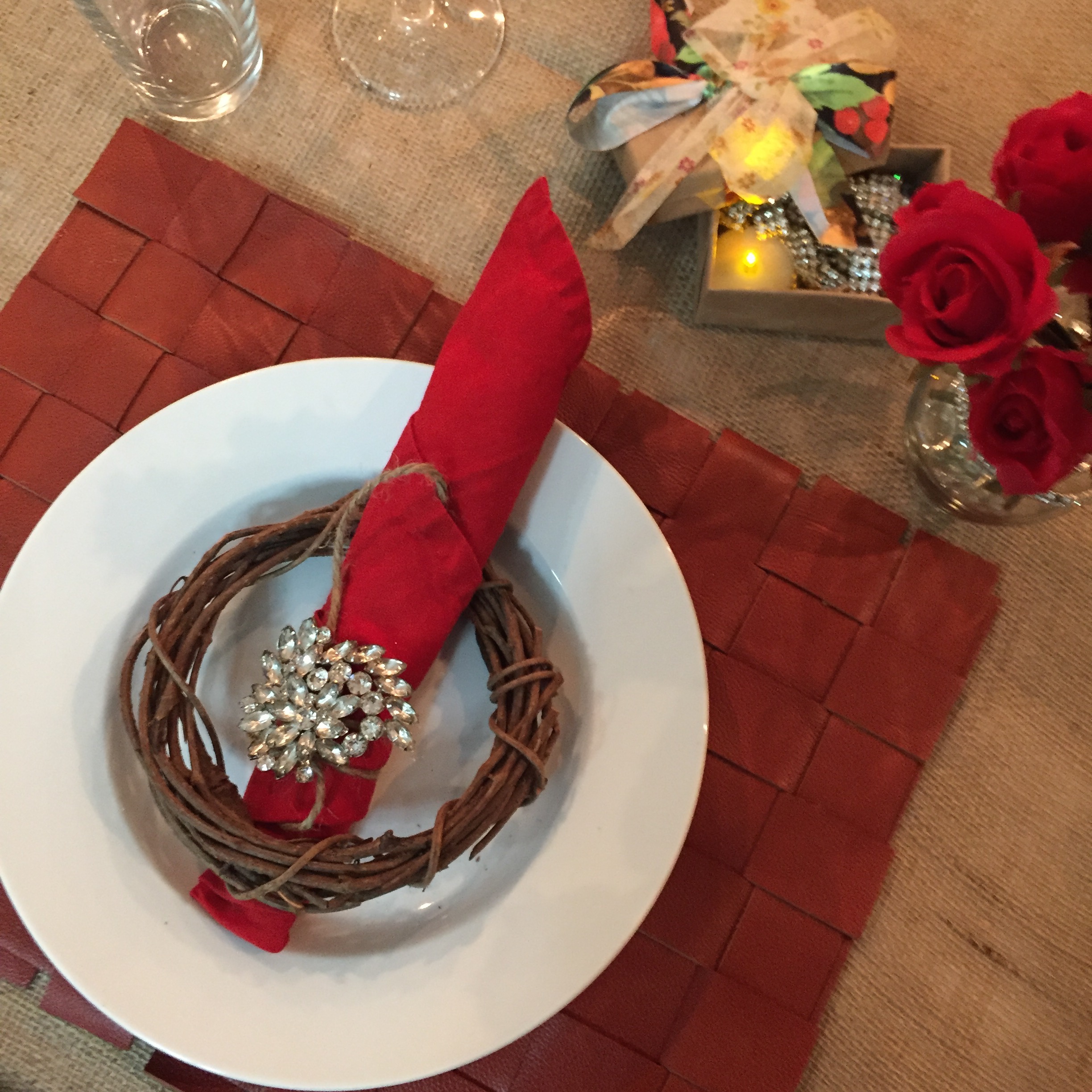 Using one white plate, lay it on top of a woven leather placemat, the linen can be a complimentary color like brown, beige, rust orange, deep burgundy. You can absolutely incorporate burlap into these theme. Simply, tie your utensils in the napkin by wrapping it with a piece of twine, add a piece of vintage jewelry to the knot. For the centerpiece, find a small barn wood crate to place the pot of flowers in or cover a smallish jewelry box with craft paper, add some ribbon around the top and drop in some gemstone jewelry pieces and a battery operated tea light. For the last touch of glam, add more gemstone pins to the tabletop or vase. It’s fancy without being too serious.