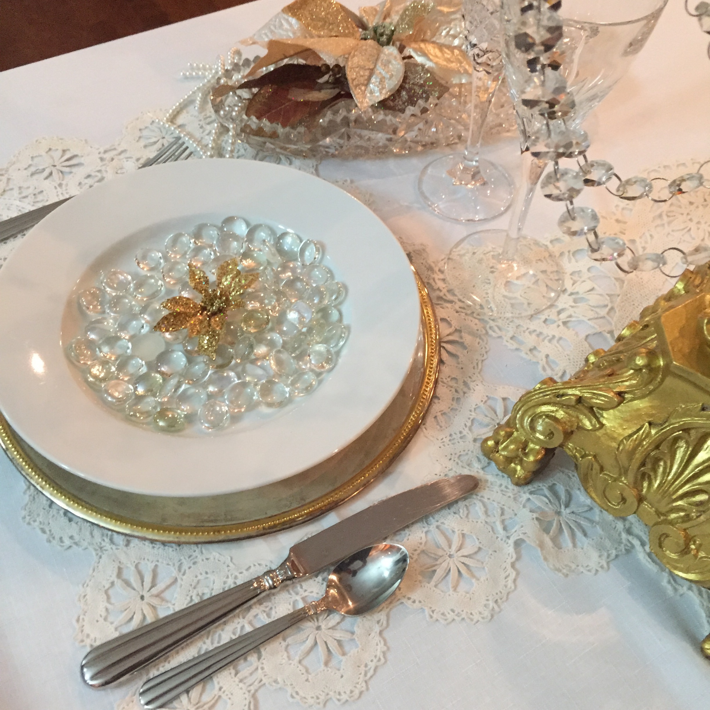 Using one white plate, lay it on a metallic charger plate then build your layers of elegance from there. You can use bright white linens; pull out the vintage lace tablecloths and metallic faux flowers to set in crystal vases and bowls. To up the level of elegance, add champagne flutes or wine glasses trimmed with gold rims and serve them on a repurposed serving tray. Finish off the table centerpiece with a DIY gold candelabra that is just dripping with crystals to make it a vintage Hollywood, classically pretty table.