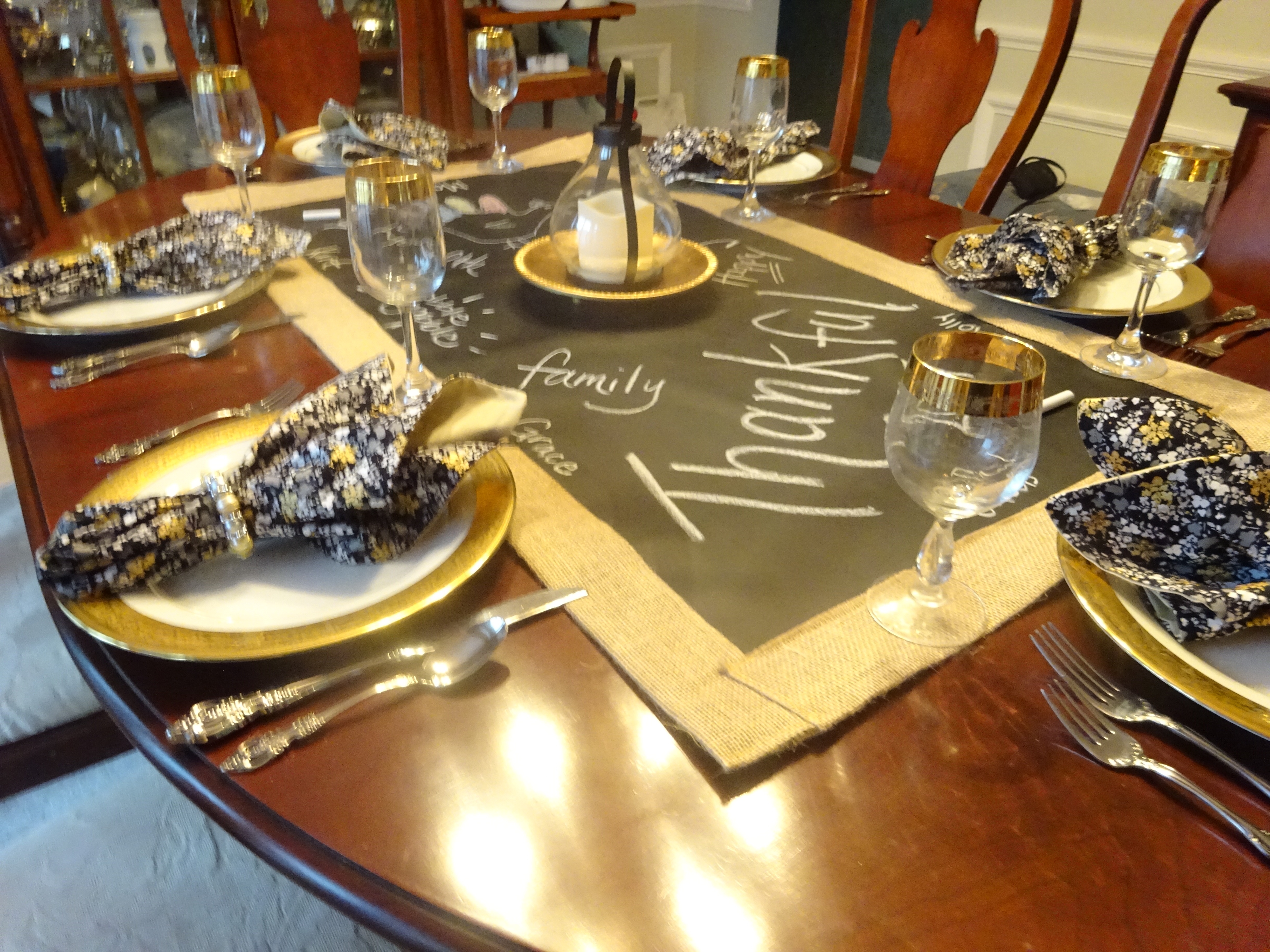 The simple ideas can be achieved with the odds and ends, fabric scraps, beads, linens, ribbons and jewels you already have at home. Ideas are endless for your tabletop; do a table setting with one bold pop of color throughout, gather up some fall leaves to scatter on the table, or use chalk board fabric as the table runner so everyone can write what they are thankful for. All you need to do is start with one white plate and let your imagination soar!