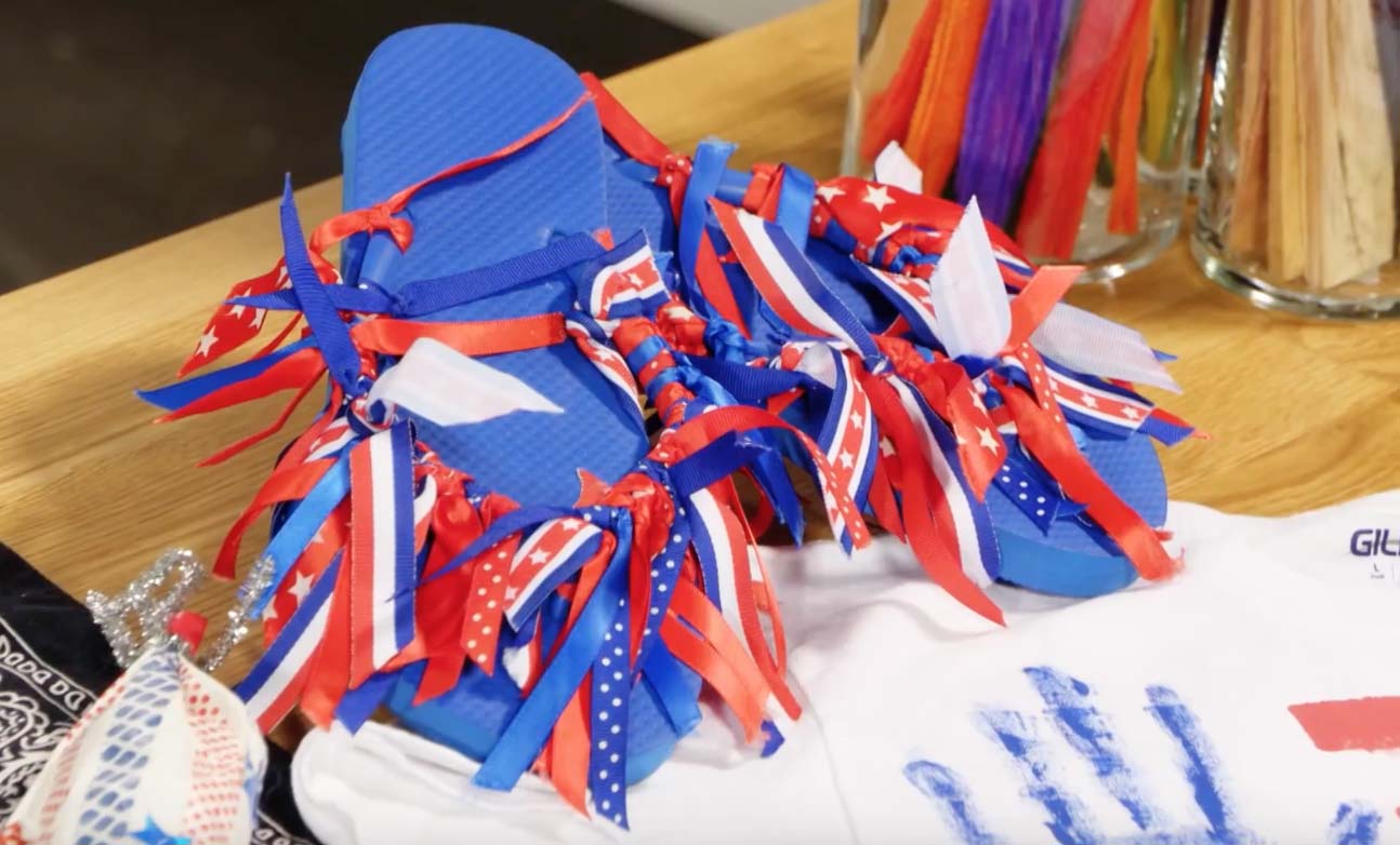 Make your feet festive by tying strips of red white and blue ribbon to a plain pair of flip flops.