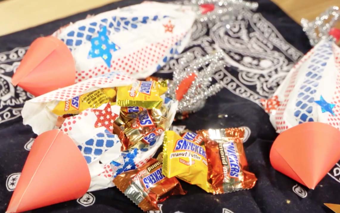 Rocket candy bags are an explosive gift for the kids. Using white paper bags, add stars stickers and stripes, fill them with candy, wrap the edges with tape and then add the finishing touches like a red cone to one end and glitter pip cleaner to the other. Then let the kids rip them open and enjoy the big surprise inside.