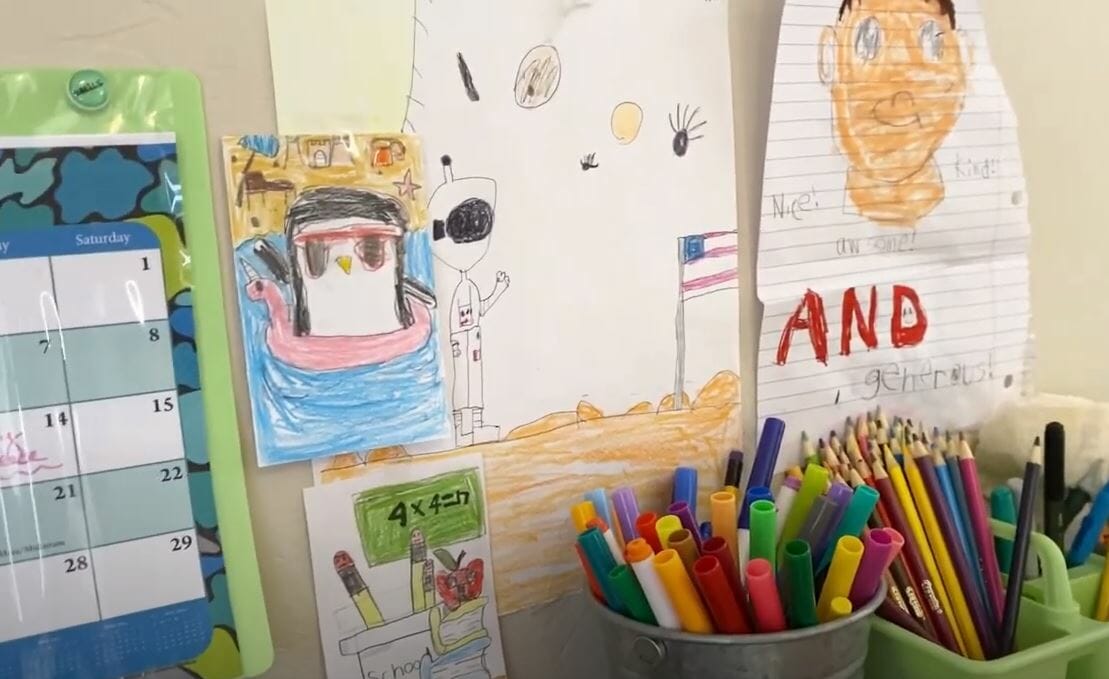 If your child doesn’t have enough space in their room for a desk and they have to use yours, make it feel like their own space by decorating the area with some of their artwork. Also be sure to have their school supplies and tools readily available throughout the day.