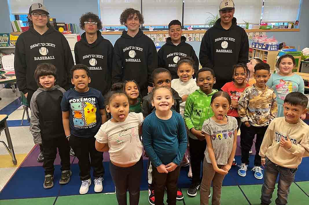 For 15 years, Murray has taken his Tolman team to read at elementary schools throughout the city. This year, for the first time, he took his Pawtucket team. Together, wearing gray Pawtucket hats and sweatshirts, the players visited five schools across the city.