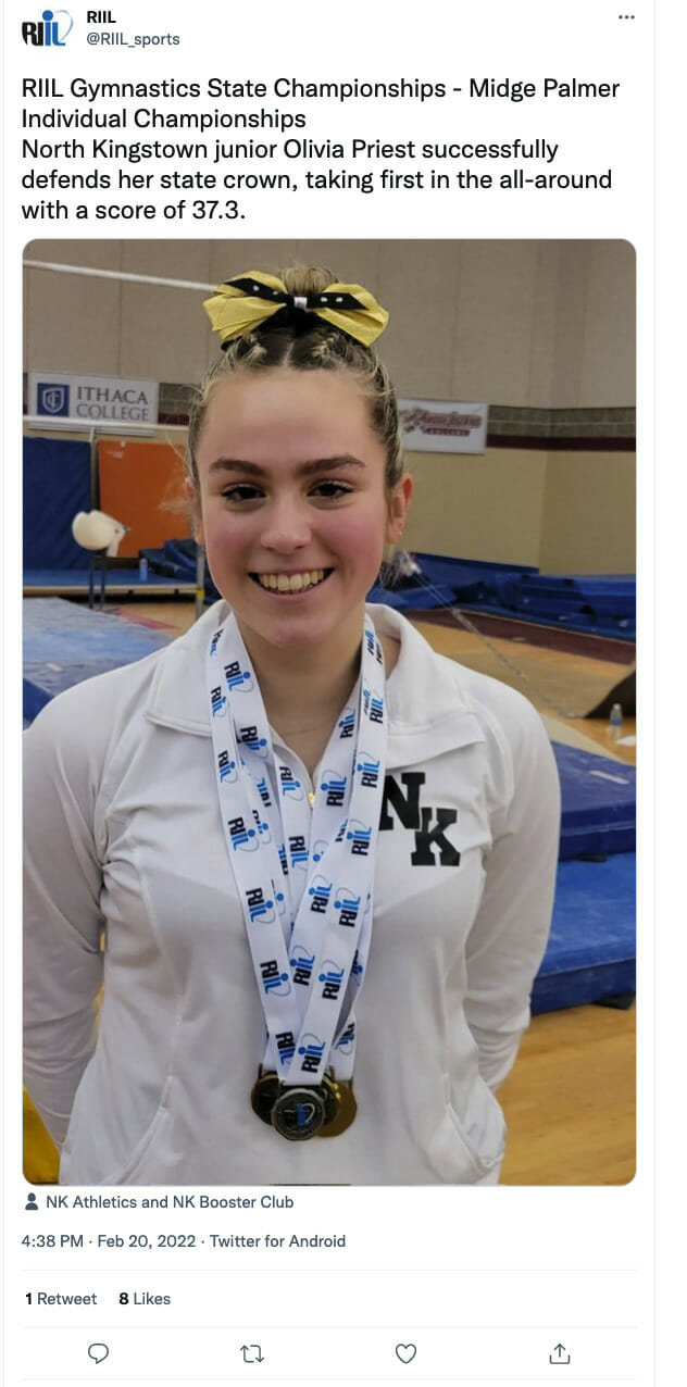 She wasn’t planning to compete at all this season, but just three weeks after the clunky boot was removed, a determined Priest taped up her ankle and headed back to Rhode Island college. Priest showed no signs of a setback and turned in an outstanding all-around performance, and she was crowned the Rhode Island Individual State Champion for the second straight year.