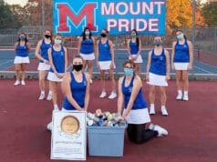 But this straight set victory over East Greenwich’s Omicioli was special. Ballarin overcame an arm injury late in the season and capped her final high school season avenging a disappointing loss to Omicioli in the 2019 finals (4-6, 6-2, 6-3). The loss ended Ballarin’s perfect season. From that day forward, Ballarin worked hard on and off the court to improve both her physical game and mental toughness.