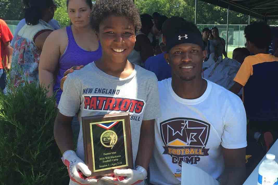 The photograph shows a young boy with a huge smile posing with NFL veteran and Bishop Hendricken All-American Will Blackmon. The 9-year-old boy is holding a plaque he had just received for winning the Fastest Man Award at Blackmon’s annual youth camp.
