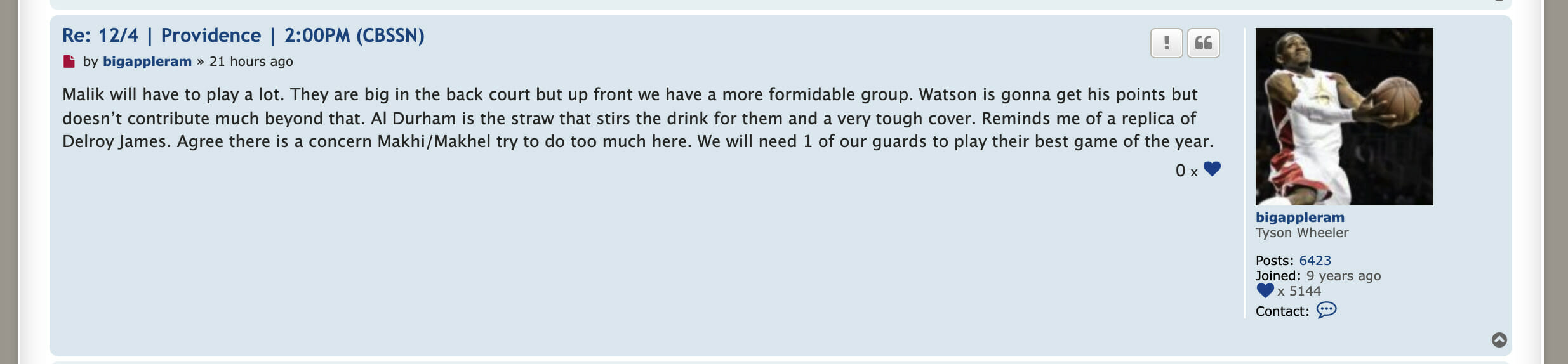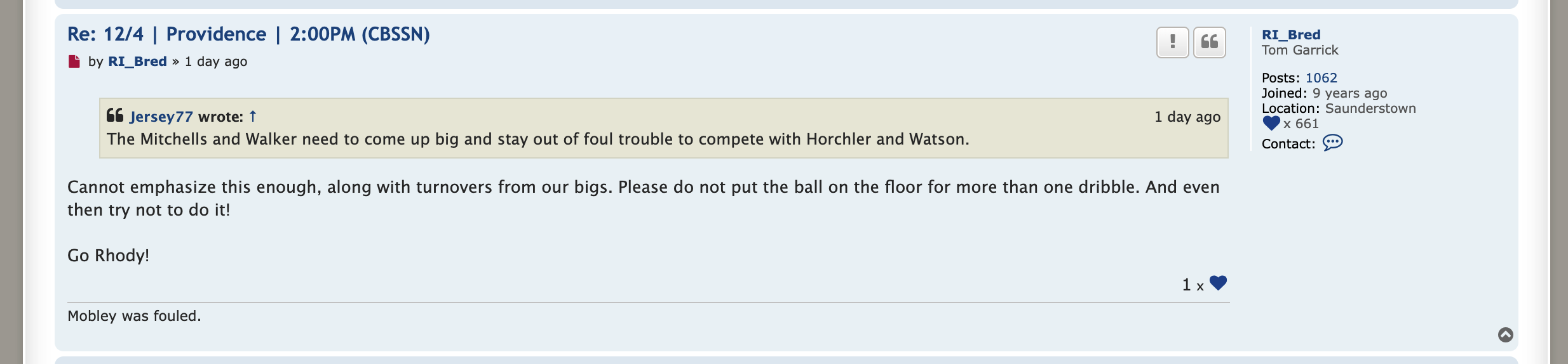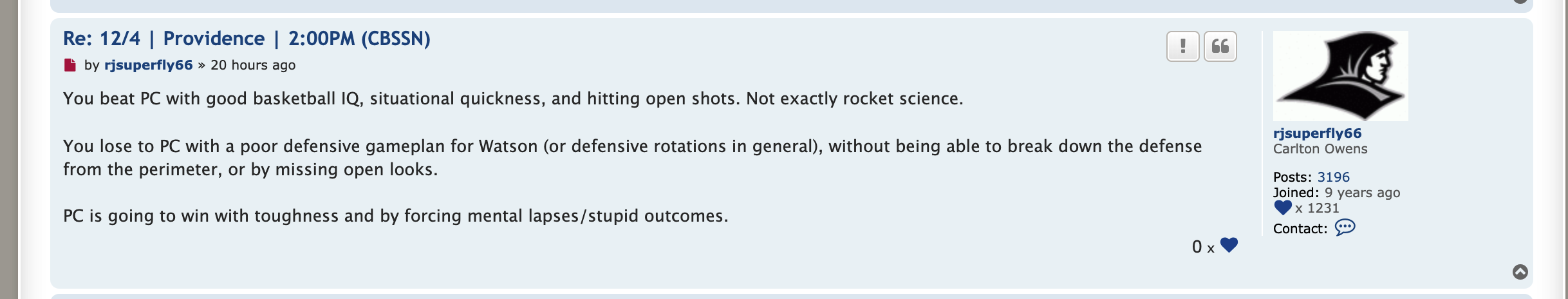 The Friars will be a stiff test for David Cox’s squad. They’re well-coached and will mix defenses. Offensively, it’s incumbent on Rhode Island players to make sound decisions about time and space available to exploit seams, deliver passes, or release shots given PC’s length. It’s about being aware and intentional, not playing timid. Just as PC will attempt to turn the tables on URI’s length, so must URI. Boxers call it “closing the grounds” when they get into a fighter who has superior reach and neutralize their opponent’s ability to fight free and rangy in space. Reactive length isn’t as effective as proactive length. An intriguing subplot to watch.