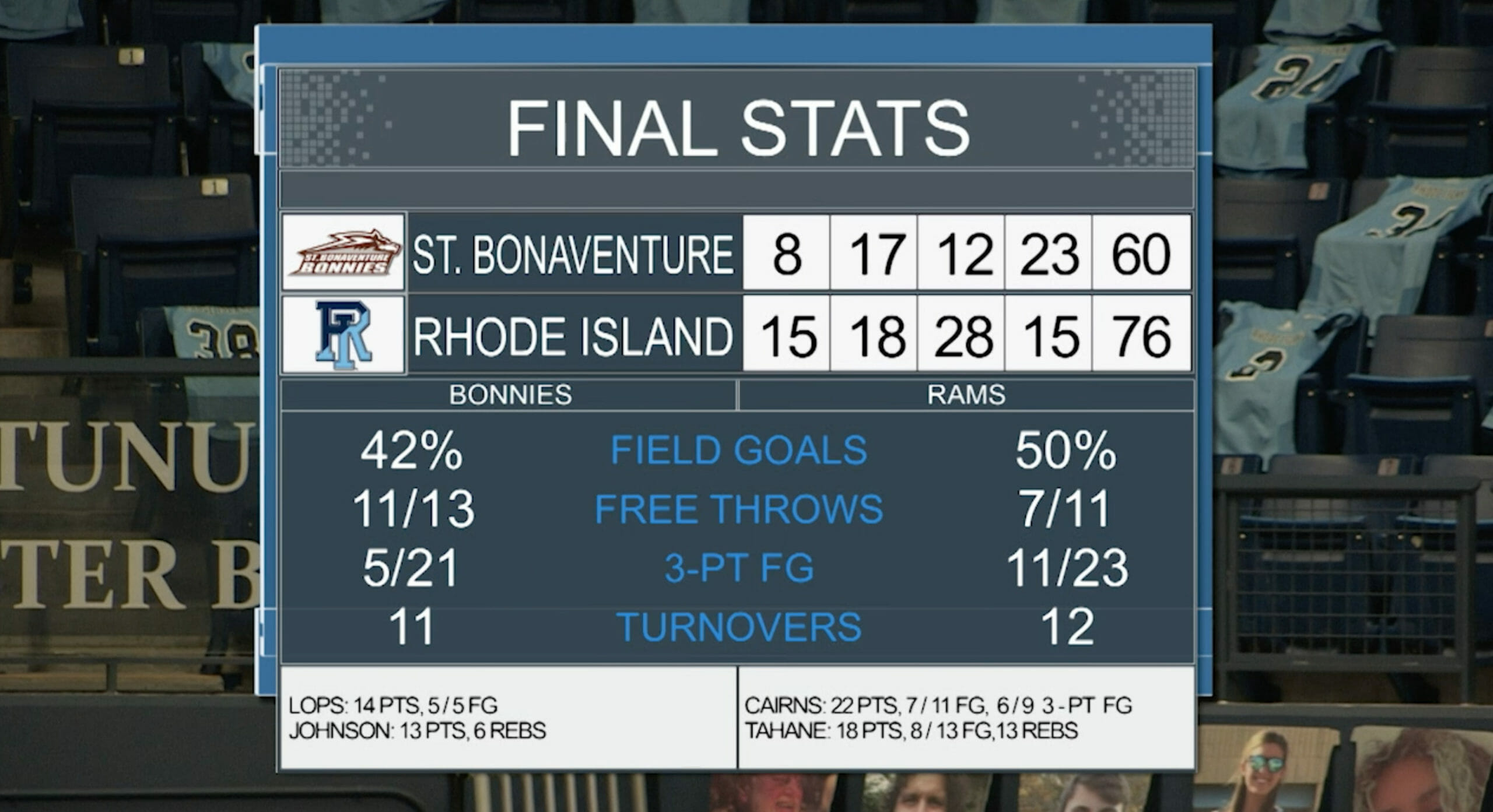 Freshman Catherine Cairns and redshirt junior Emmanuelle Tahane combined for 40 as Rhode Island dominated St. Bonaventure, 76-60, Saturday afternoon.