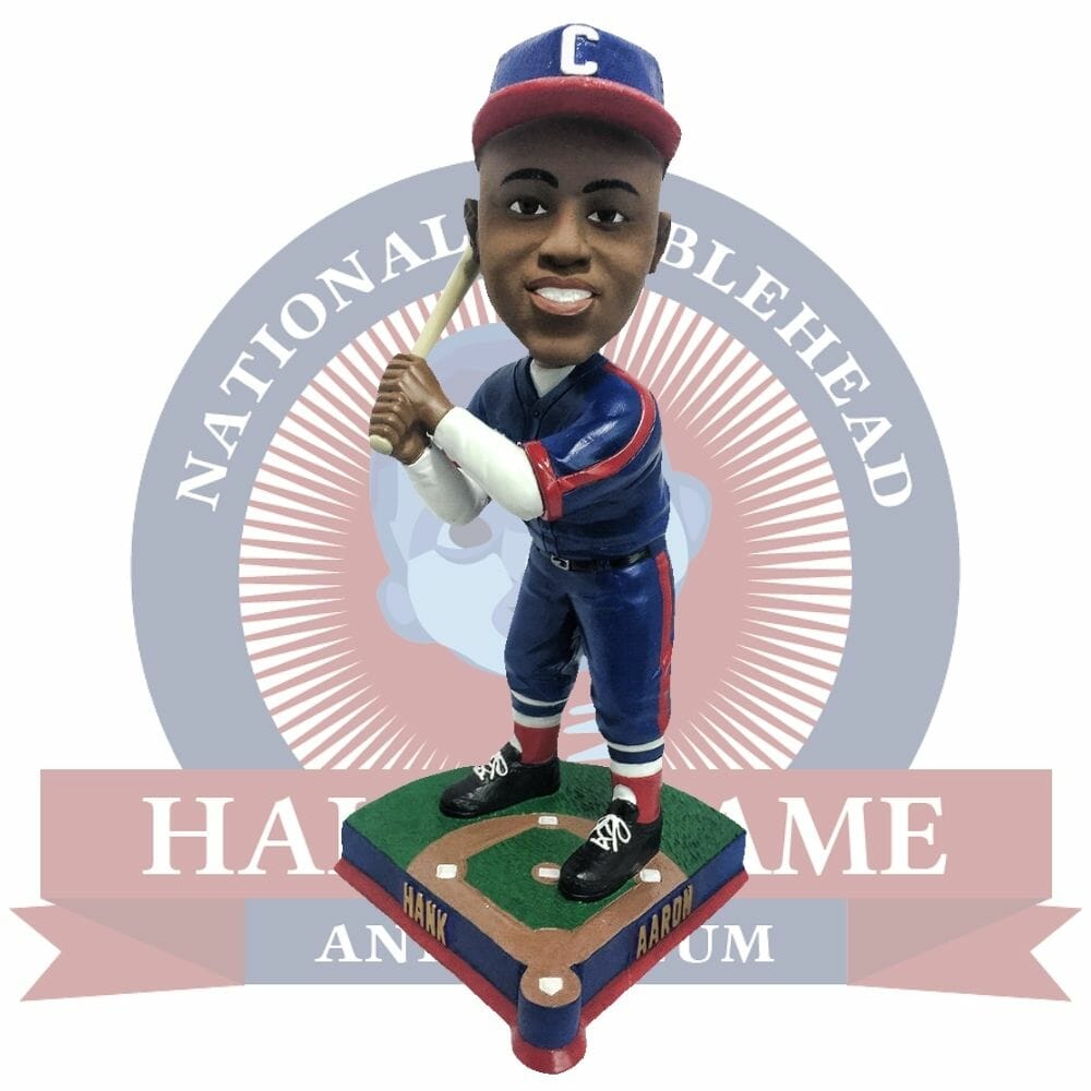 The two bobbleheads commemorate the three months that Aaron spent with the Clowns during the 1952 season which was his first in professional baseball. They are individually numbered to 4,136, reflecting Aaron’s career hit total (41 Negro Leagues, 324 Minor Leagues and 3,771 Major Leagues).