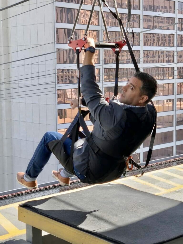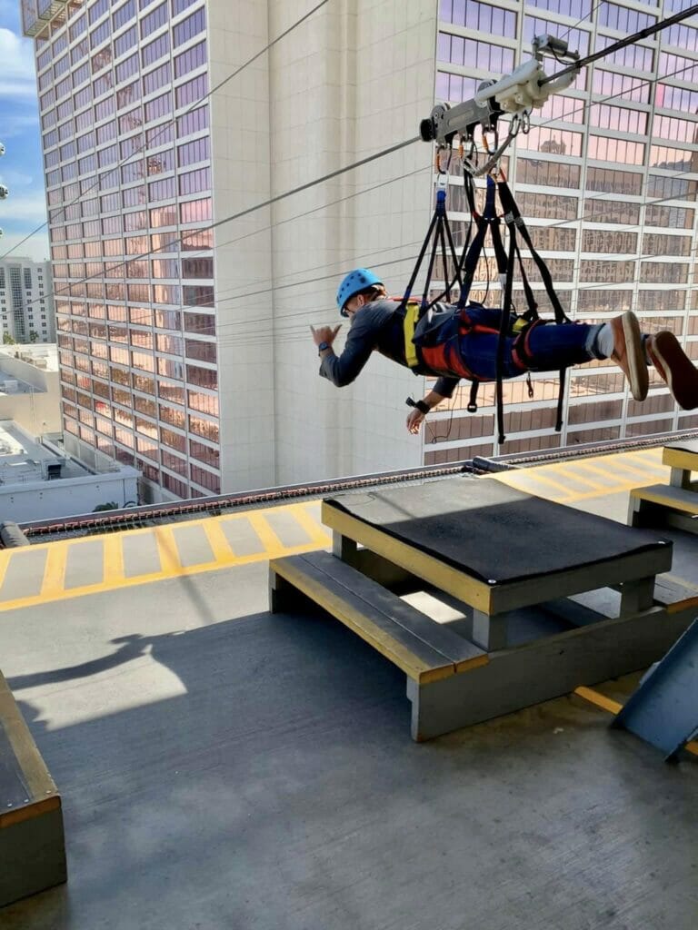 While looking up at the zipline from the promenade, it doesn’t seem so high; however, once you’re standing up on the 12-story tower getting ready to fly, you will certainly feel the excitement! Zipliners soar 1,121 feet at speeds up to 35 mph! More information on Fly LINQ can also be found on www.caesars.com.