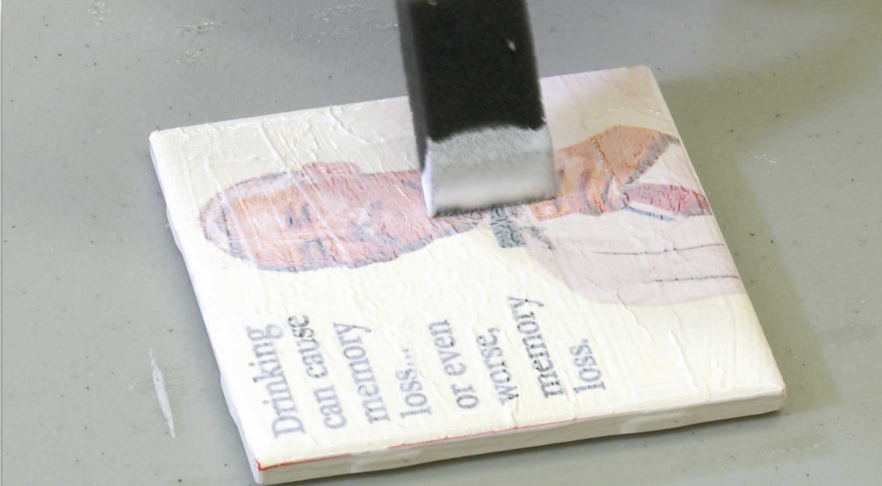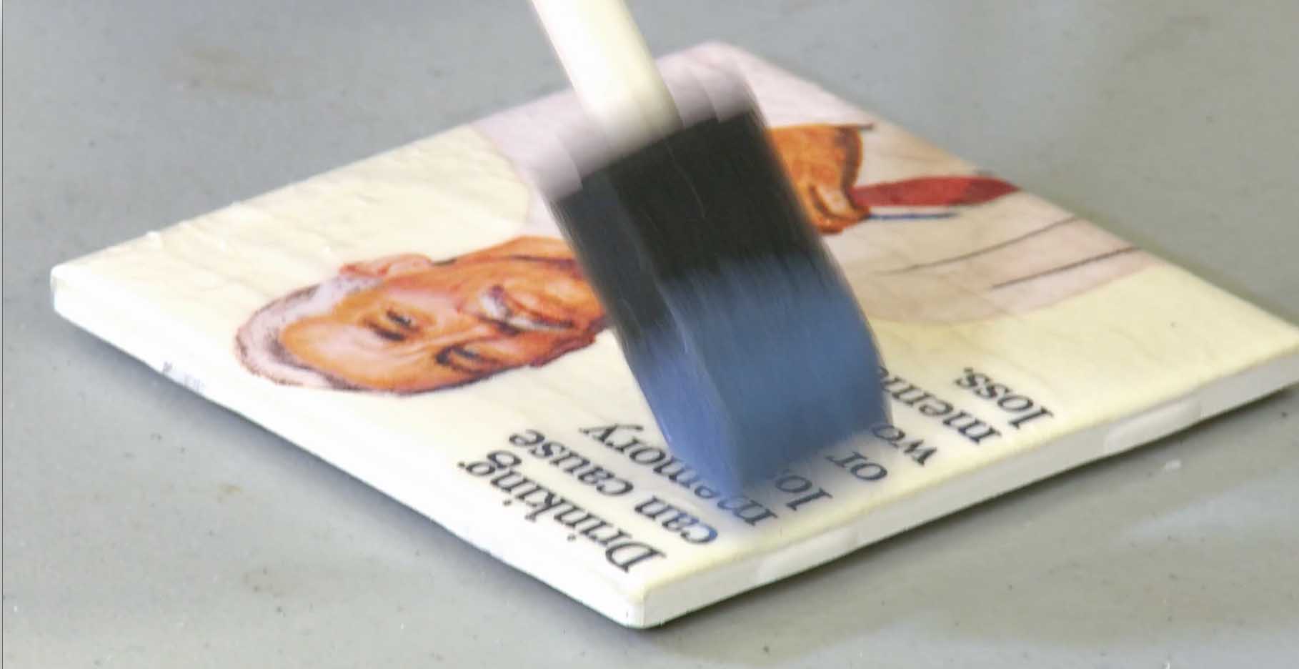 Lightly coat the ceramic tile with Mod Podge, evenly distributing the adhesive using a brush.