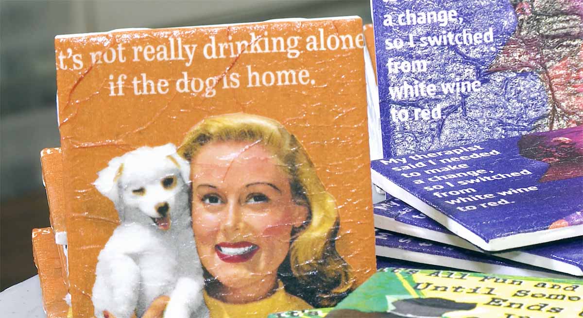 Jennifer Enck of Drinks and Crafts uses her craft space to turn funny cocktail napkins into more than just a throwaway laugh. Using simple decoupage, anyone can make a conversation piece that can last a lifetime or until you accidentally drop it after your third Moscow Mule.