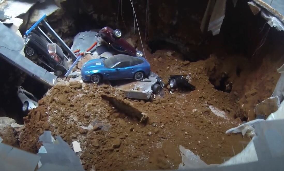 So what you’re looking at here…This is sort of the direction the floor fell out. And then eight cars were victims of the sinkhole. Three were restored, and five were beyond repair.