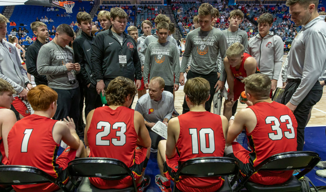 Dale head coach Jeff Edmonson addresses the team during a timeout during the Tournament of Champions, Photo Courtesy: Rick Hester and Dale Public Schools.