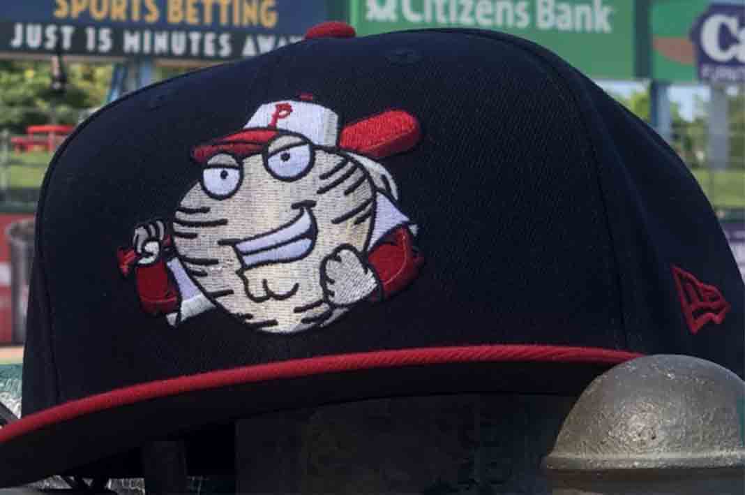 On top of the Fightin’ Quahog’s head is a hat that features a red brim and a white cap with a “P” on it. The actual on-field caps feature a red brim and a blue cap.