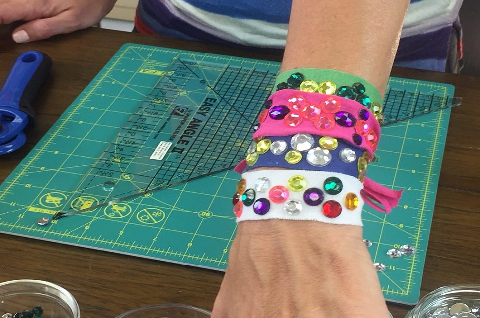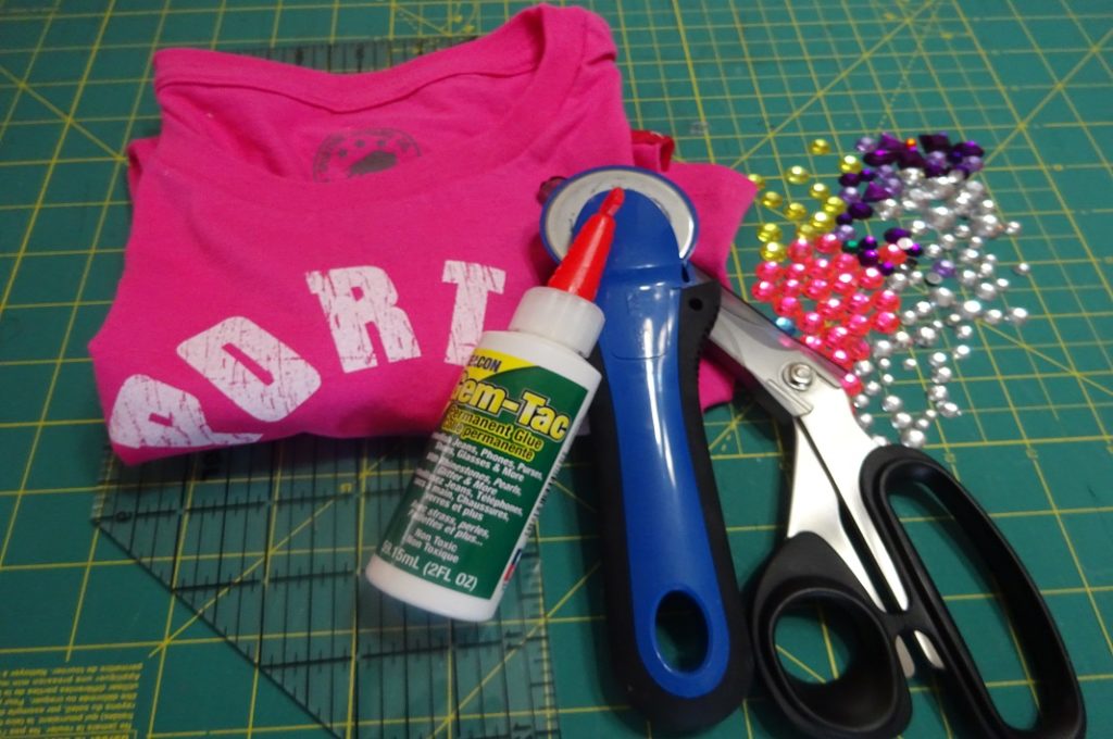 You’ll need: old t-shirts (maybe use last year’s gym shirt?!), flat back gemstones, fabric glue, scissors or a rotary cutter, and a cutting mat.