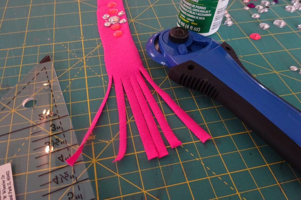 Using your rotary cutter or scissors, cut fringe about 1.5″ into both ends of the band.