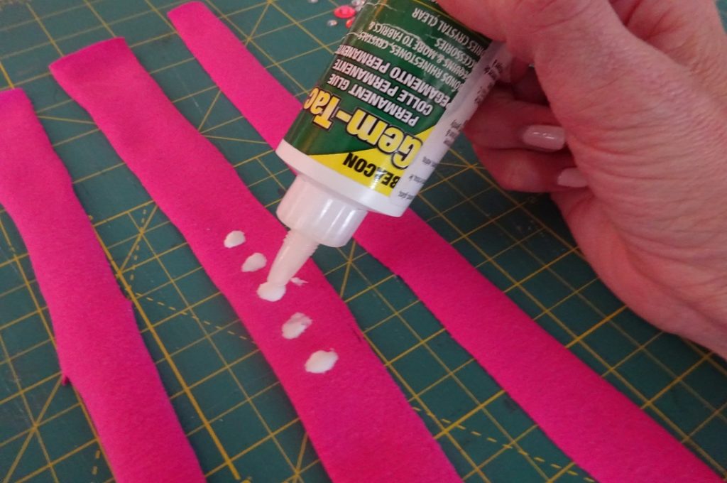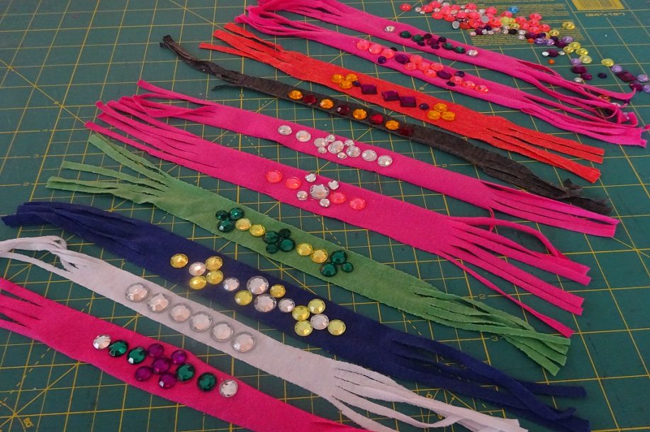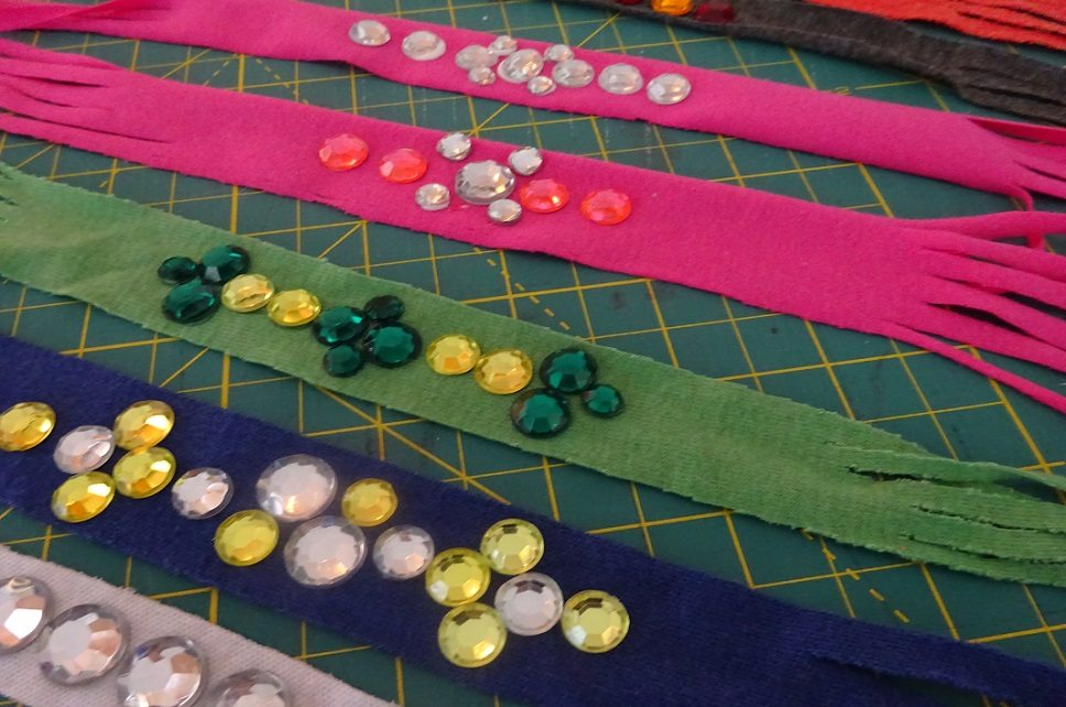 Next, glue gems in the center of the fabric band. A little dab of glue will do the trick. Use different color gems to create an interesting design or use the same color for a sophisticated look.