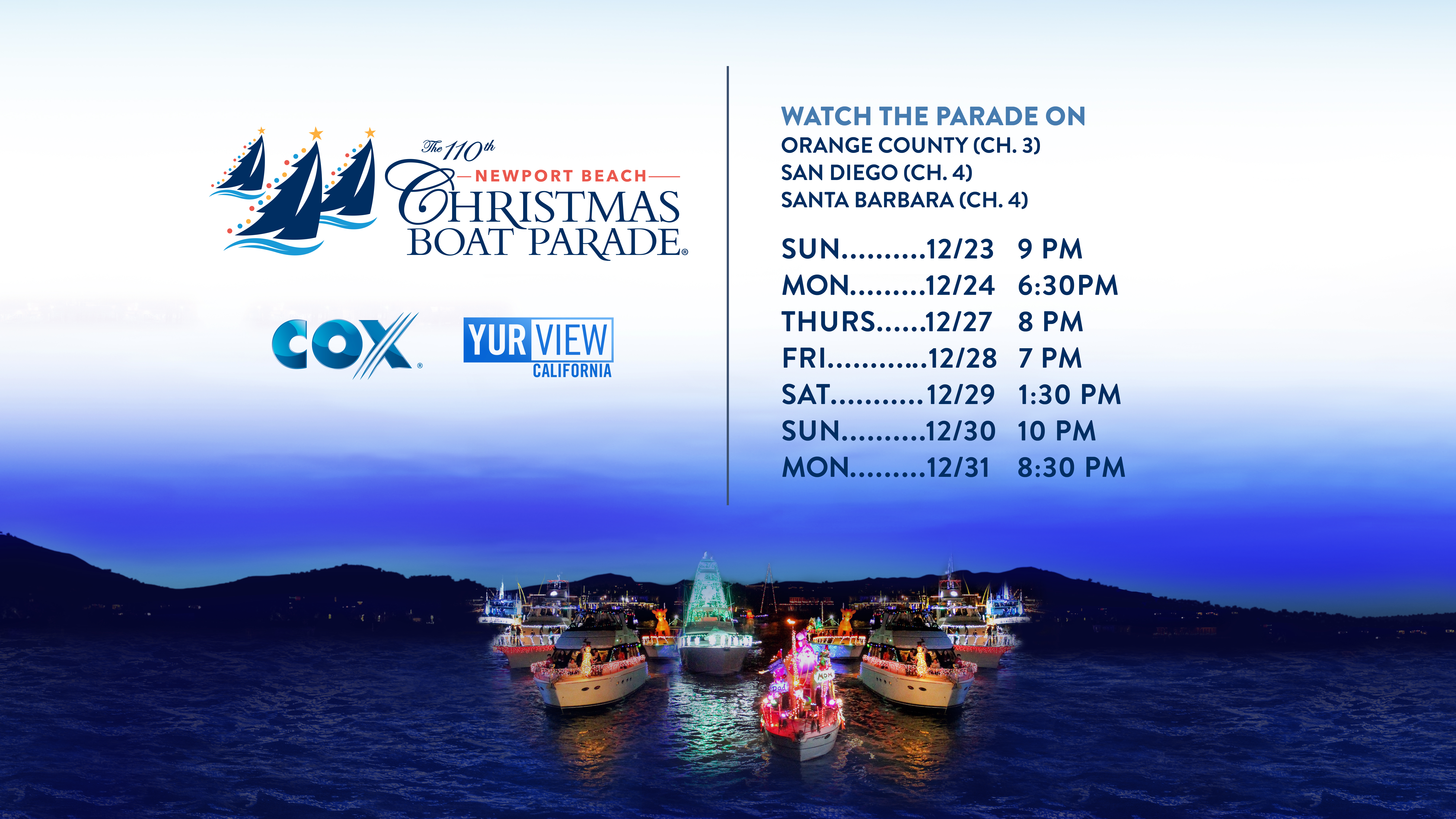 In Orange County YurView Cox Channel 3 watch “The 110th Annual Newport Beach Christmas Boat Parade” Sunday, Dec. 23rd at 9 p.m., Monday, Dec. 24th at 6:30 p.m., Thursday, December 27th at 8 p.m., Friday, Dec. 28th at 7 p.m., Saturday, Dec. 29th at 1:30 p.m., Sunday, Dec. 30th at 10 p.m. and Monday, Dec. 31st at 8:30 p.m.