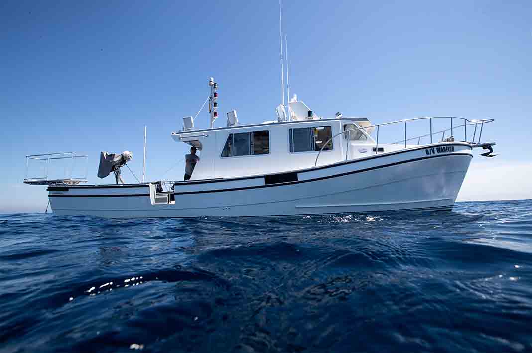 R/V Warfish is able to accommodate four people up front and up to six crew overnight with a full bathroom and shower, hot water outside shower and a stainless steel refrigerator.