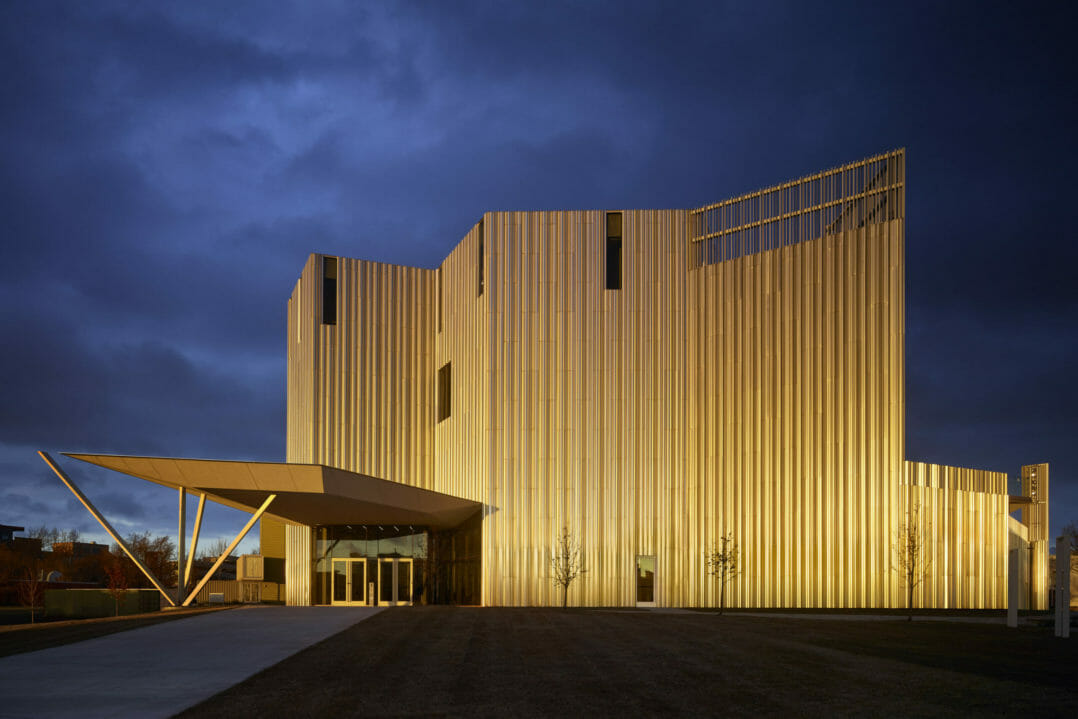 The new 53,916-square-foot, four-story building with a luminous façade captures aspects of the state’s ever-changing skyscape, reflecting and embracing the dramatic changes in weather that characterize the landscape. In addition to the 8,000 square feet of galleries for visual art, the new building includes a flexible theater space that seats 200, a dance studio and nine classroom studios.