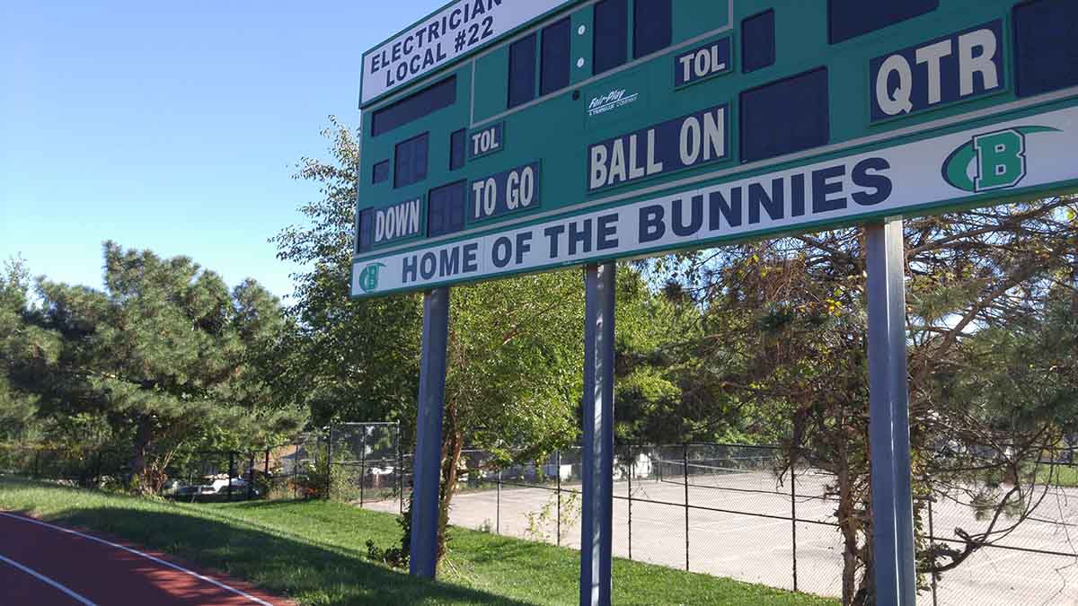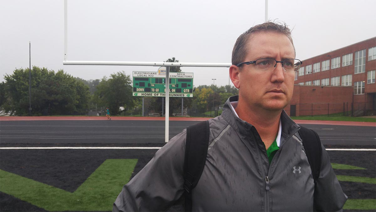 It’s a gray, misty afternoon at 52nd and Maple Streets. Tony Kobza strides down a flight of concrete steps into a bowl-shaped depression and across a track lined with evergreens. He steps out onto the plush artificial turf of the football field. A white rabbit head adorns the midfield circle. The scoreboard in the south end zone says, “Home of the Bunnies.”