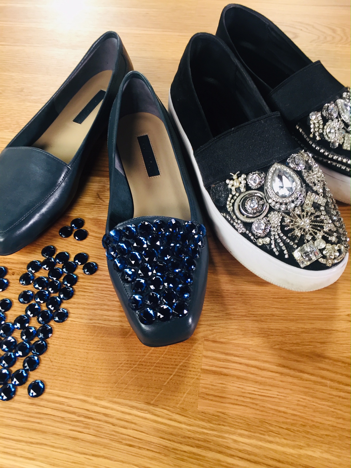 Even the comfy shoes you love can take on new life with the addition of some gems or jewels. Note, be sure to use a strong adhesive to attach the embellishment for long lasting wear.