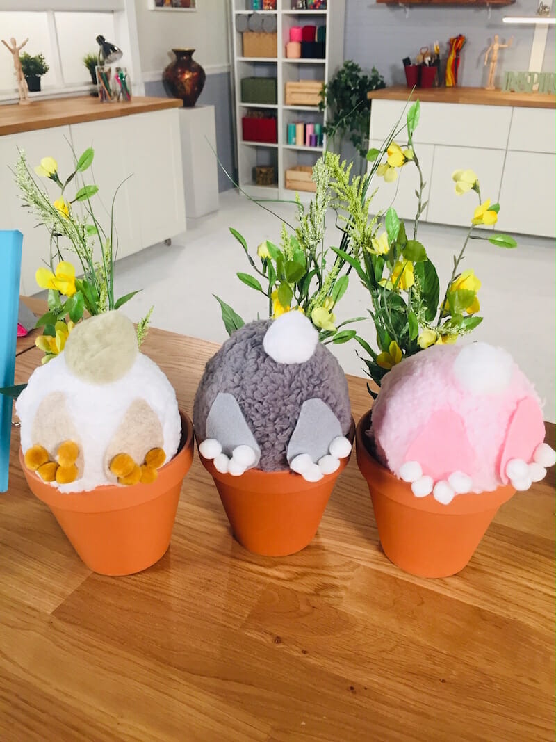 And keeping with the bunny theme, these little rascals took at dive right into the flowerpot. To make this clever project, just wrap a foam ball with fuzzy fabric, add felt feet, and a cottontail… and it’s bottoms up on a cute spring display.
