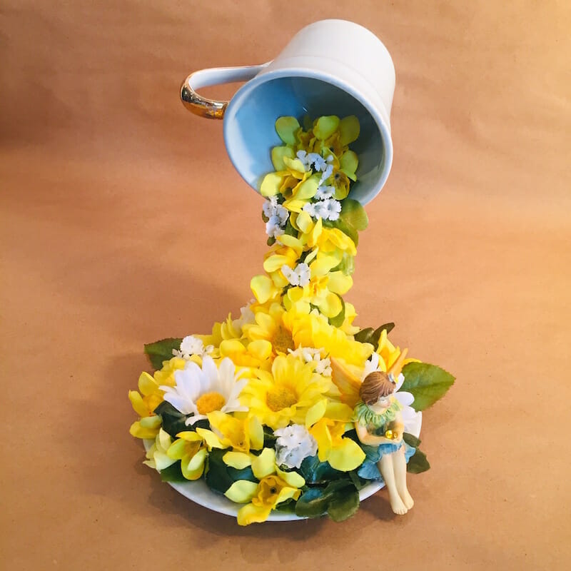 Just like magic, you can create this stunning centerpiece for your next spring-fling. To create the illusion, the secret using a fork to suspend the tea cup by bending it, then gluing it to the cup and saucer, add flower embellishments and you’ve got yourself an artful masterpiece.