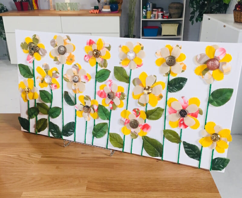 And finally, everything comes alive in the spring and your wall art should too! Create a whimsical wall tapestry by using fabric flowers, yarn and pretty buttons. No watering needed for this spring-inspired project.