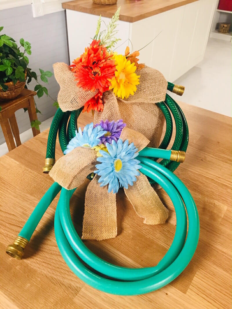 The easiest way to spruce up your home is to give your front door some love with this Garden Hose Wreath! Buy a 4-foot garden hose, or just use an old one you already have, coil it up and add flowers and a bow and you are ready to go. Your entryway never looked so inviting. Hello spring!