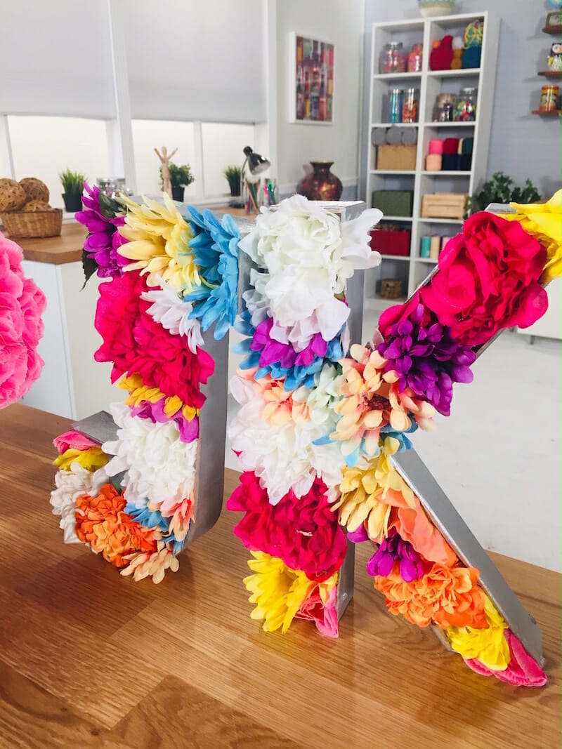 Another great tip to create personalized spring DIY decor is to take oversized boring letters to in-bloom initials…. glue faux flowers into cardboard letters. This makes a great home-office decoration too!