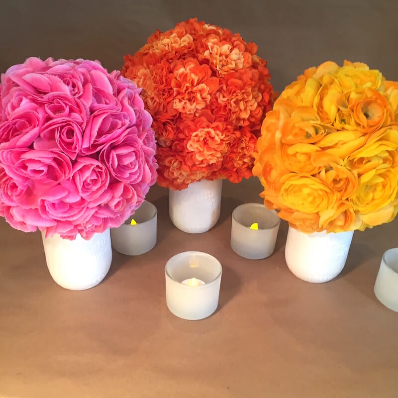 An easy way to add more flowers to your home is with this Mason jar floral display. Paint a mason jar, then glue on a foam ball and insert the stems. This will give a pop of color to brighten up any room.