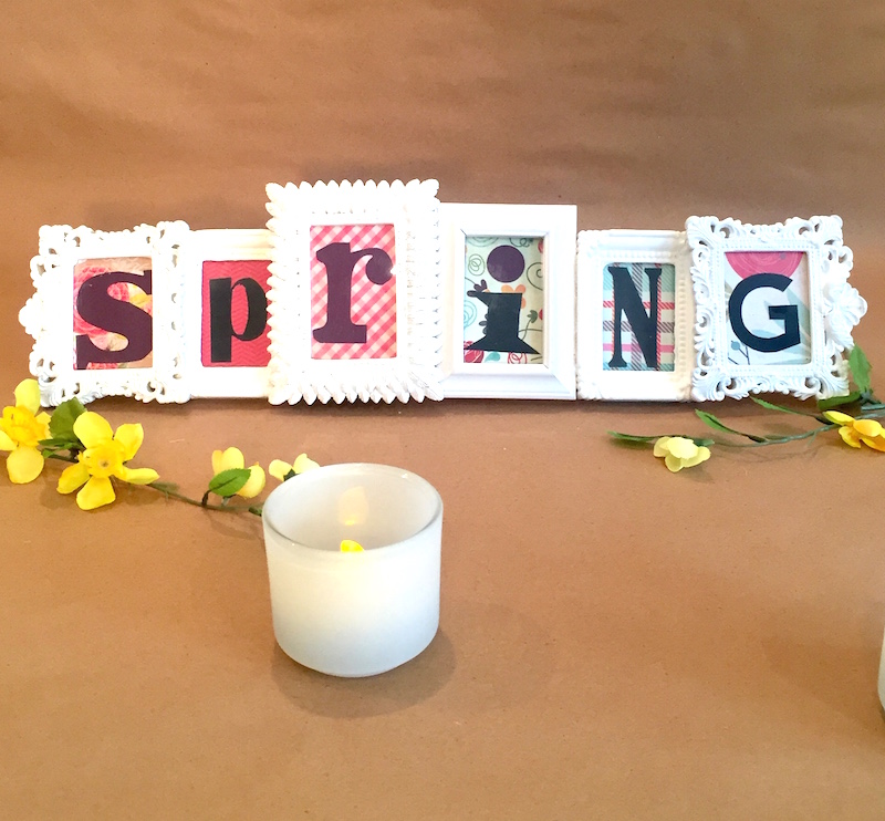 This frame sign says it all. All you do glue mini frames together, add fancy card stock with printed letters to spell SPRING! You can personalize it too using a family name, or another word like love or flowers or blooms or bunnies.