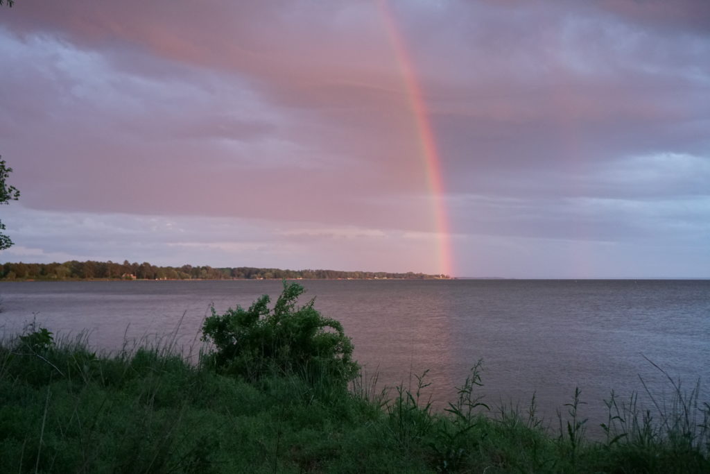 After packing up my kayak, I started to drive towards the exit when I had a change of heart and decided to turn around just in case nature had a surprise in store. I could not have been more elated when a huge double rainbow streaked across the sky and seemed to cut right into the river. A perfect end to a glorious day.