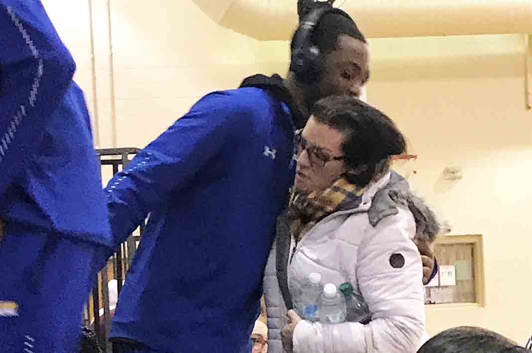The junior varsity game was underway when Capaldi entered the gym. The NP varsity team was sitting in the stands watching the game. When they saw Capaldi walk towards them, one by one each member of the team got up from their seat and went over to Capaldi and hugged the woman wearing North Providence basketball branded sweatshirt and sweatpants.