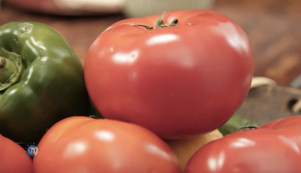 Throw your tomatoes in a bowl and on to the cucumber! To make it look a little more fancy, you can slice your cucumbers on an angle. Toss those in the bowl with the tomato, and next up Karen slices up a green pepper!