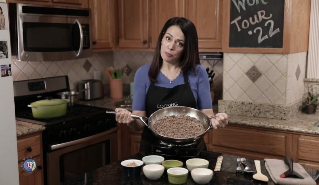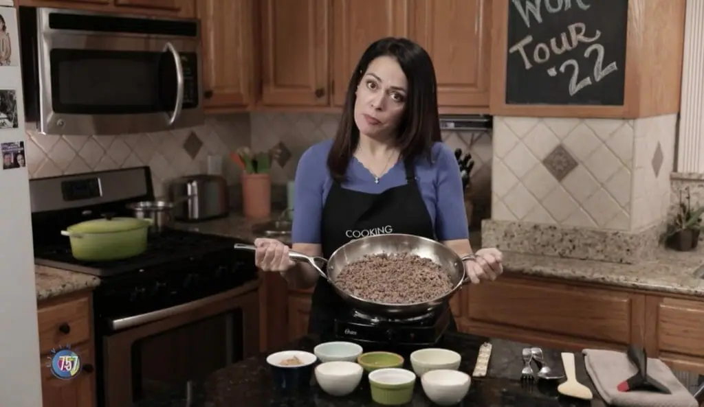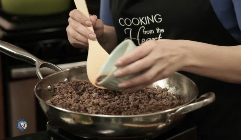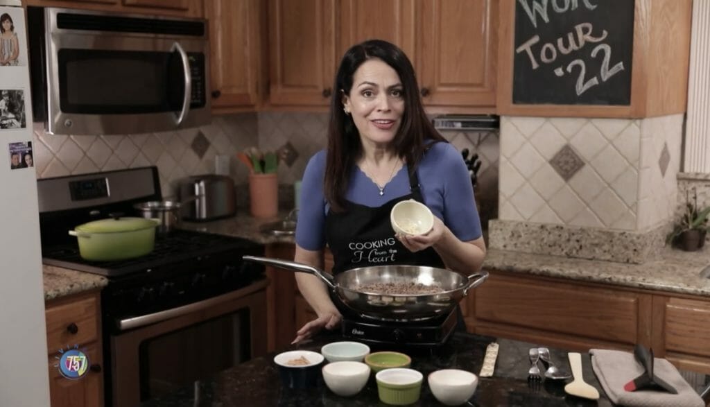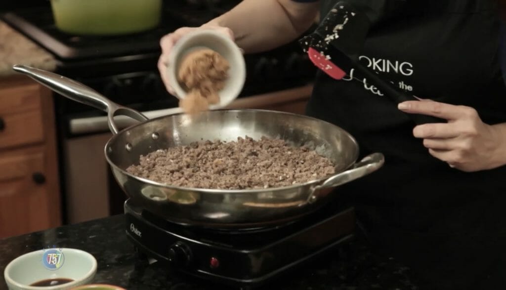 To add to the Asian flavor of the Korean Beef, Karen adds two teaspoons of toasted sesame oil next. It doesn’t have to be toasted if you don’t have it, regular sesame oil will do just fine!