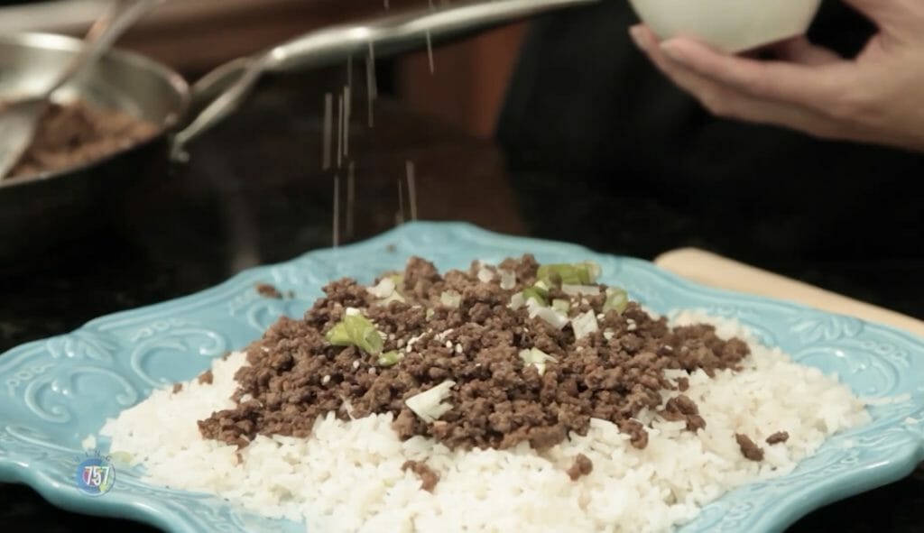 Finally, it’s time to plate! Spread your scrumptious beef mix over a bed of steamed rice, garnish with some green scallions and some sesame seeds- and VOILA! Enjoy!