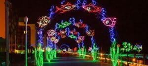 Also right here in the 757, the BayPort Credit Union Holiday Lights at the Beach. At this drive through event, you’ll drive right on the Virginia Beach ocean front boardwalk through holiday, nautical, and adventure-themed light displays. Turn on your radios to a soundtrack playing traditional holiday music, and enjoy the brightly colored fish, crabs, and hard-working elves. You’ll see Santa taking off from the pier, a 40-foot tall dancing light Christmas tree, color-changing archways, and light displays that honor our Armed Forces community. Also expect shorter lines this year with timed entry.
