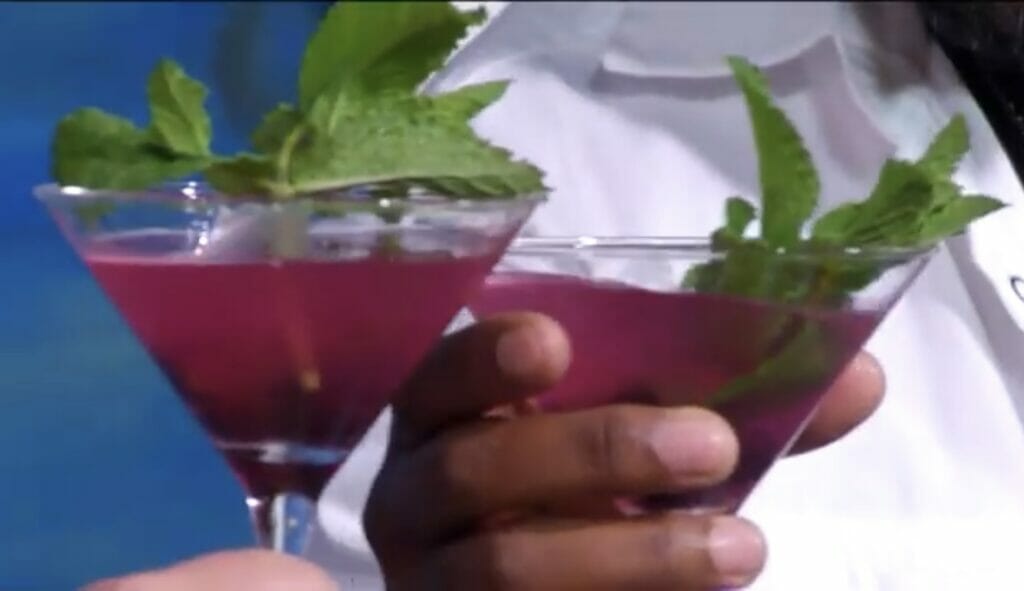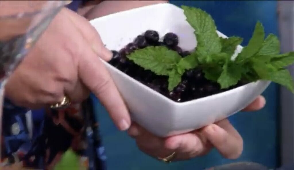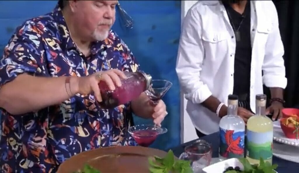To make the cocktails: in a cocktail shaker, add 1 tablespoon blueberry compote, 2 ounces vodka (in today’s segment we use Chesapeake Bay Distillery’s Blue Ridge Vodka), and 2 ounces limoncello or other lemon liqueur (in today’s segment we use Chesapeake Bay Distillery’s Lemon Liqueur). Fill the shaker with ice, cover, and shake vigorously until blended.