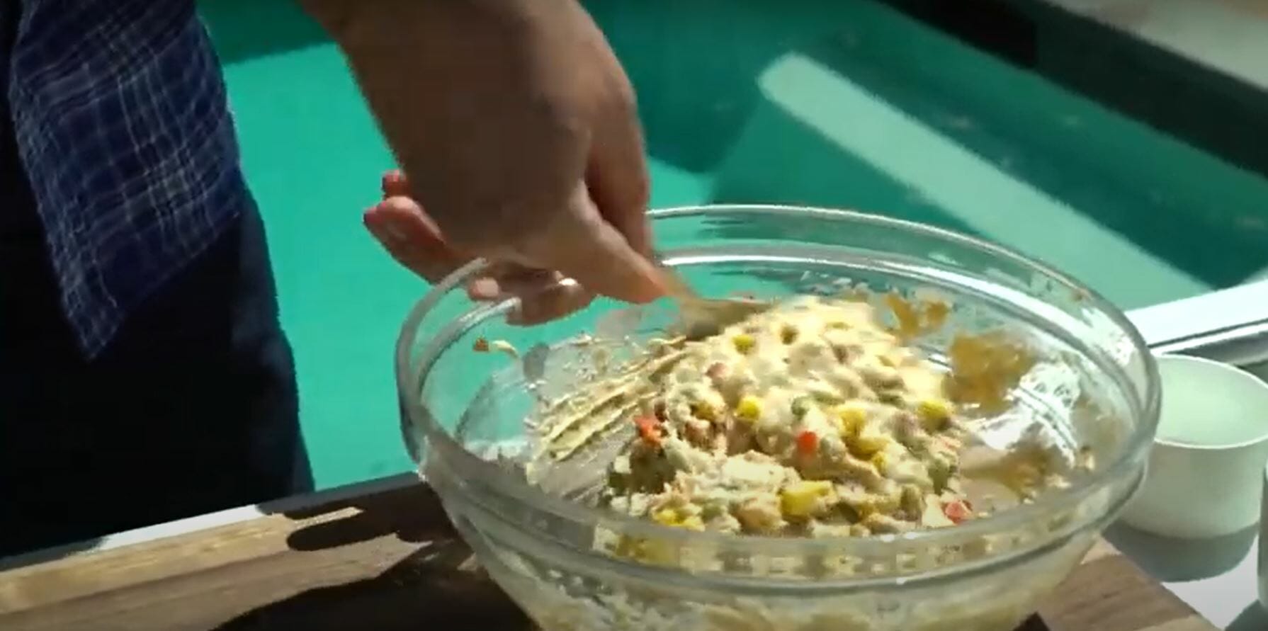 NR – (1:59) Now we’ve got all these other fabulous ingredients in here to go into these fish fritters, but of course you got to start off with a little bit of fish. I have some cod here in cod is a nice, neutral mild white fish. Now it’s time to put this into that batter. So you want fish fritters that tastes like fish but adding a few of these fabulous ingredients are going to add so much more depth. So I’m going to start off with some jalapeno peppers, just everything super small diced and a little bit of red onion. So not too much red onion because they were going in with raw red onion, but a little bit is going to enhance it. Some chopped red bell pepper, one ingredient that goes perfect with clam cakes, lobster cakes, fish fitters, anything along those lines is corn. And I’m going to add about a quarter cup. I’m gonna go with some chopped parsley. And that is it. We have this beautiful little batter here that’s ready to rumble and we’re going to mix it up, scooping from the bottom so that our fish cakes have a little bit of everything in each bite.